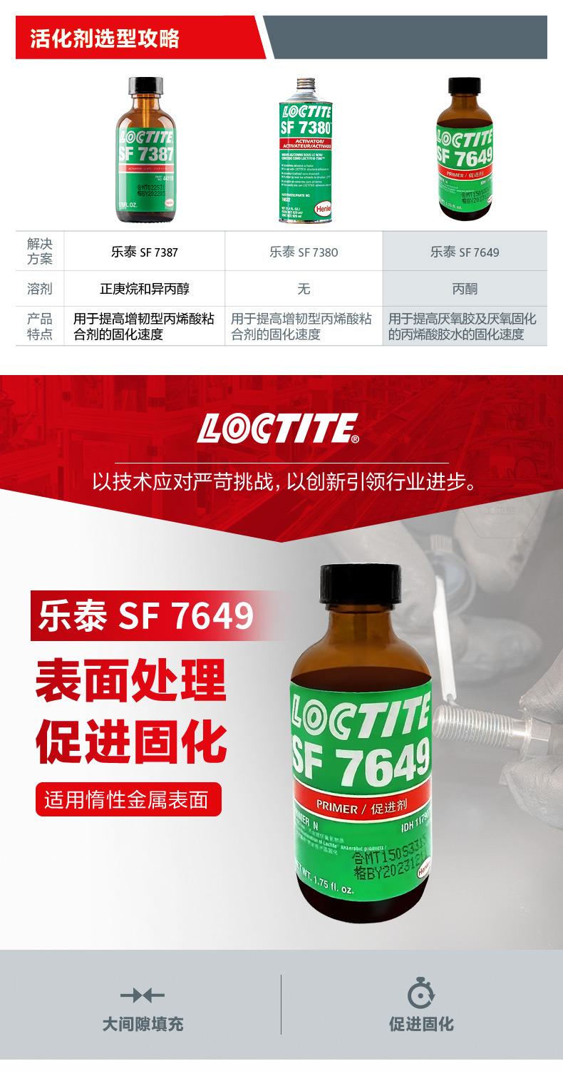 乐泰SF7649是一款用于表面处理、促进固化的溶剂型促进剂。乐泰SF7649适用于惰性金属表面,可促进乐泰厌氧胶在非活性金属表面的固化速度,并兼顾大间隙填充需求。对于需要加快固化速度、间隙较大,或一般在10℃以下使用促进剂的场景,乐泰SF7649更有针对性。乐泰SF7649规格为1.75oz和4.5oz,外观为透明、绿色,溶剂类型为丙酮,溶剂挥发时间30-70秒,粘度2mPa·s,在件寿命≤30天,质保期18个月(8-21℃阴凉干燥处)。