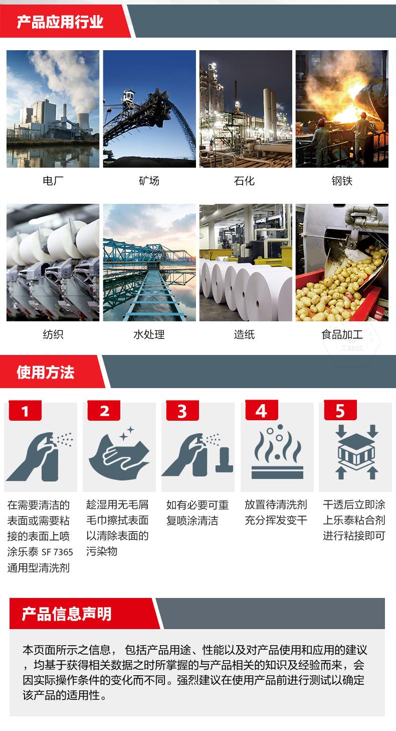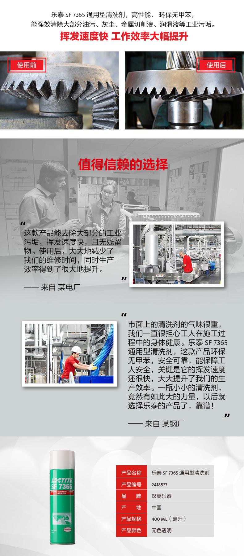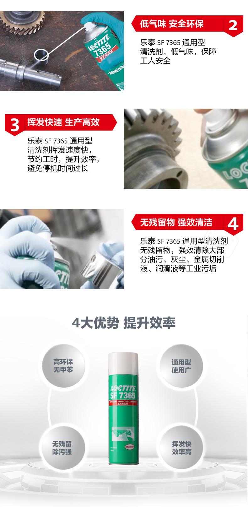乐泰SF7365通用型清洗剂是一款高性能、环保无甲苯的零部件清洗剂。乐泰SF7365通用型清洗剂低气味,使用更安全;乐泰SF7365通用型清洗剂挥发快,可节约工时、提升效率。对于油污、灰尘、金属切削液、润滑液等工业污垢,乐泰SF7365通用型清洗剂可实现无残留强效清洁,适用范围覆盖电厂、矿场、石化、钢铁、纺织、水处理、造纸和食品加工行业。