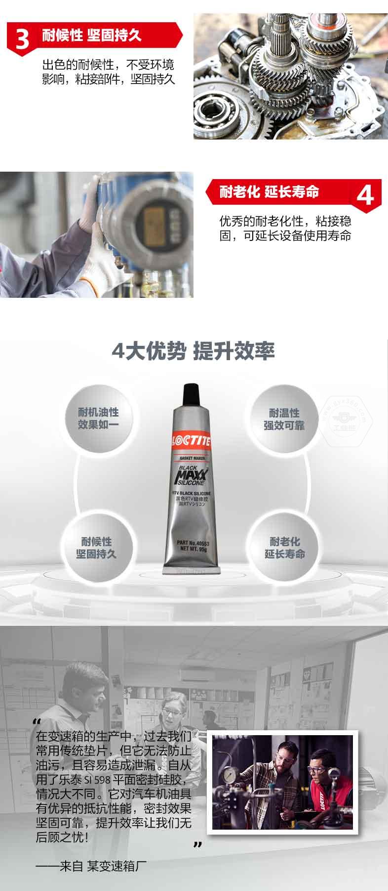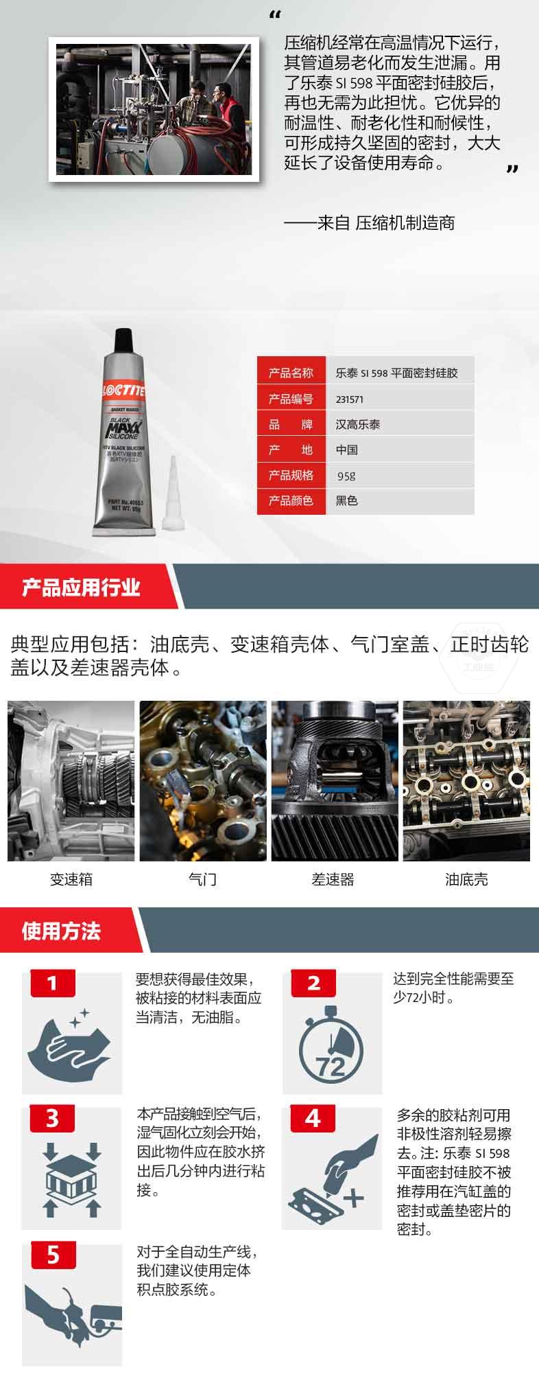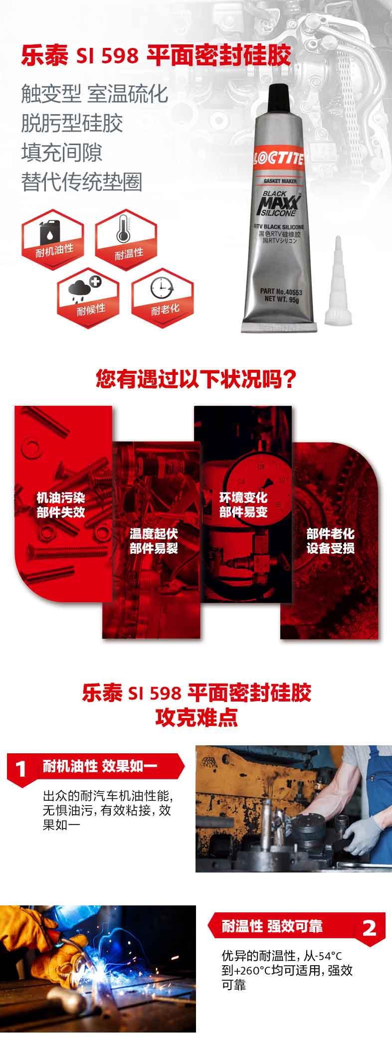 乐泰SI598平面密封硅胶是一款触变型、室温硫化的脱肟型硅胶。乐泰SI598平面密封硅胶可填充间隙,替代传统垫圈。乐泰SI598平面密封硅胶具备出色的耐机油性能,适用于汽车机油环境;同时乐泰SI598平面密封硅胶还具有耐温、耐候和耐老化特点,其中耐温范围为-54℃到+260℃。乐泰SI598平面密封硅胶典型应用包括油底壳、变速箱壳体、气门室盖、正时齿轮盖以及差速器壳体。